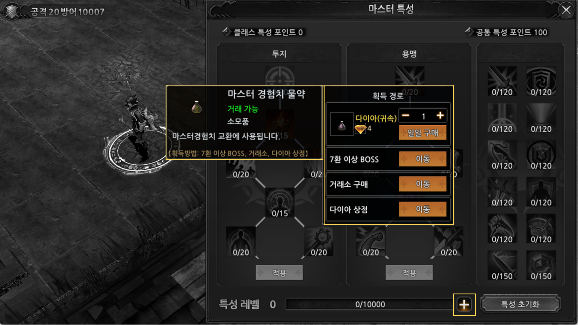 ‘마스터 경험치 물약’을 얻으셨다면, 특성 레벨 경험치 옆에 있는 [+]버튼을 터치하여