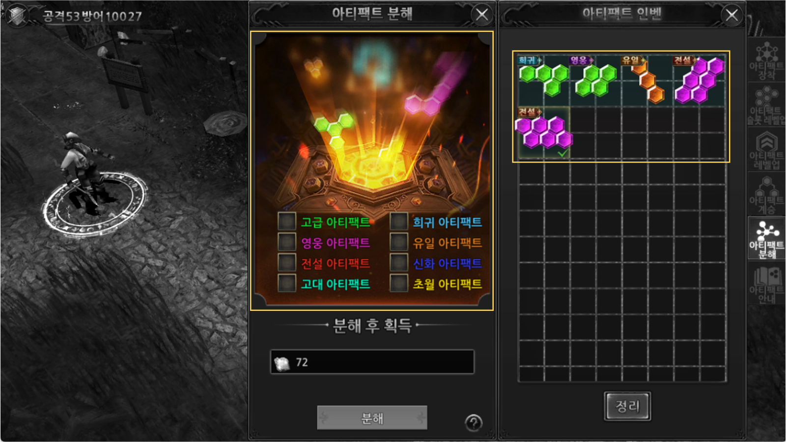 아티팩트 분해는 [아티팩트] → [아티팩트 분해] 화면에서 진행됩니다.