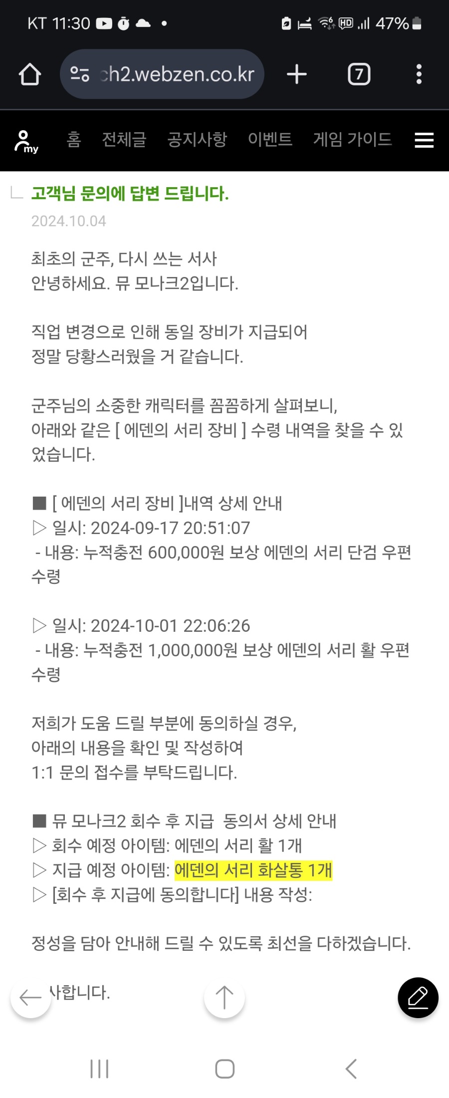 최초의 군주, 다시 쓰는 서사 안녕하세요. GM 흑마법사입니다. 1:1 문의 답변과 관련하여 게시물을 남겨 주셨습니다. 우선, 군주님께서 접수해 주신 문의는 정상 접수되었으며, 현재 관련 부서에서 면밀히 확인 중인 상황입니다. 단, 죄송스럽게도, 저희 뮤 모나크2 고객 센터는 접수된 차례대로 안내를 도와드리고 있는 상황인데요.