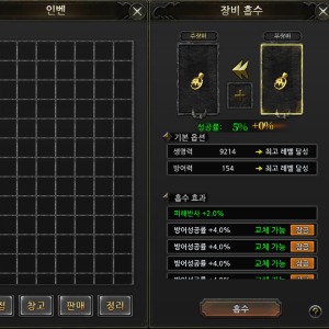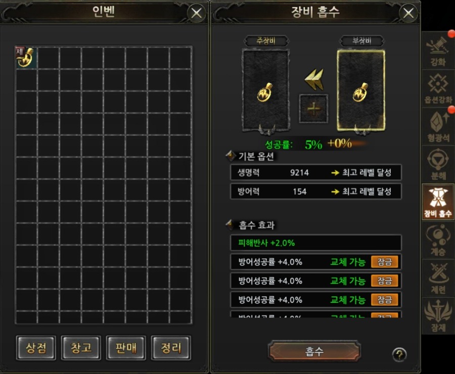현제 장착중인 다크프레이 귀걸이 좌측 옵션 중 방성에서 피해반사 옵션을 장비흡수로 2번 성공하였는데