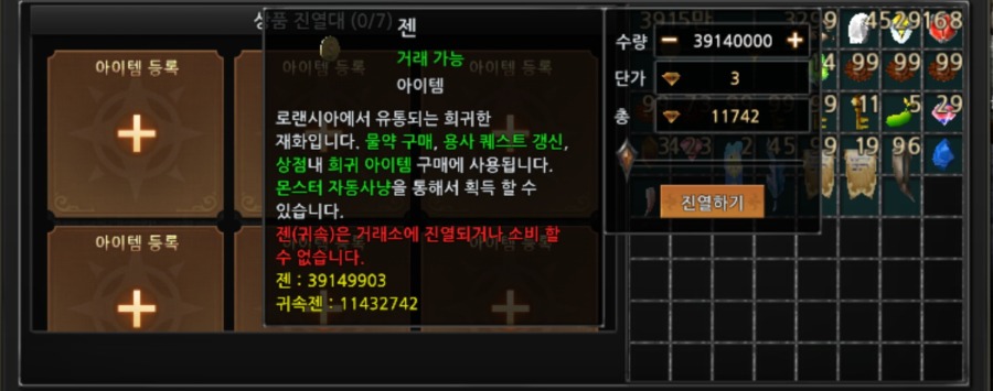 최초의 군주, 다시 쓰는 서사 안녕하세요. GM 흑마법사입니다. 거래소에서 젠을 판매하는 방식을 말씀해 주셨네요. 젠을 거래소에 등록하기 어려운 시스템으로 인해 불편을 겪고 계신 점 진심으로 송구스러운 마음입니다. 말씀해 주신 시스템에 대한 개선 방안을 담당 부서에 전달하여 논의될 수 있도록 최선을 다하겠습니다. 다만, 즉각적인 조치나 개별적인 안내가 어려운 점 군주님의 너른 양해 부탁드립니다.