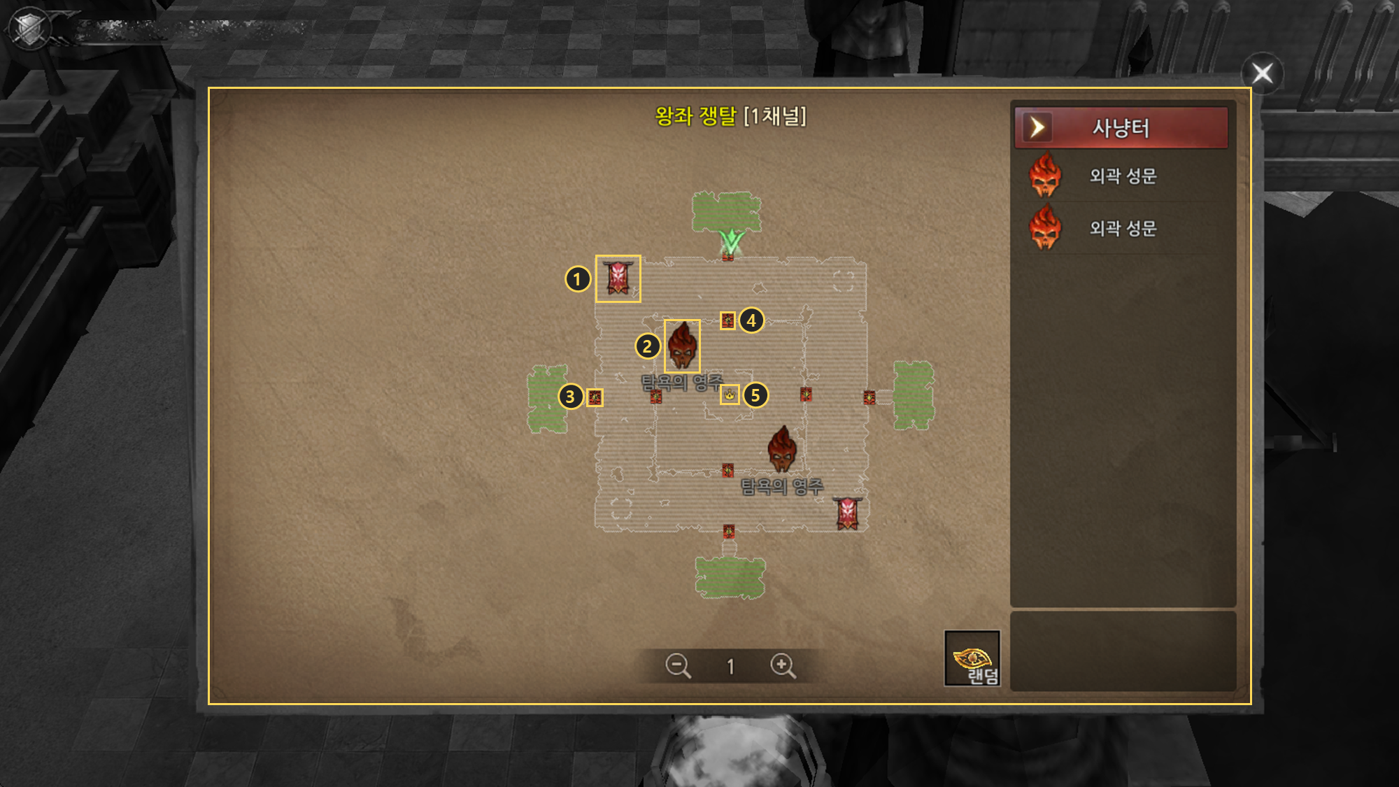 외부 성문과 내부 성문 및 깃발, 몬스터 위치 등을 맵에서 확인할 수 있습니다.