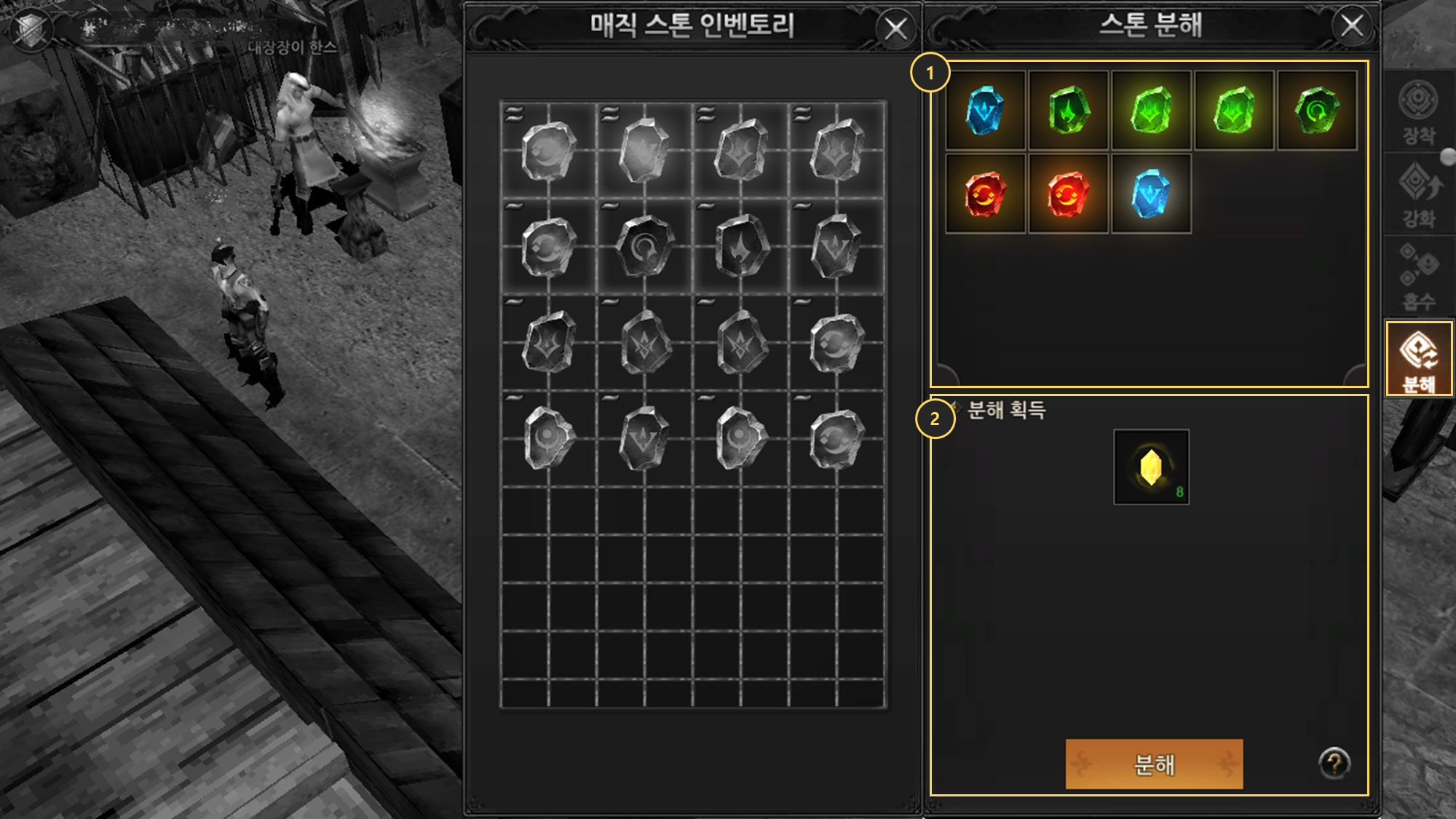 [분해]는 자신이 보유 중인 '스톤'을 분해하여 '매직 스톤 흡수석'을 획득하는 기능입니다.