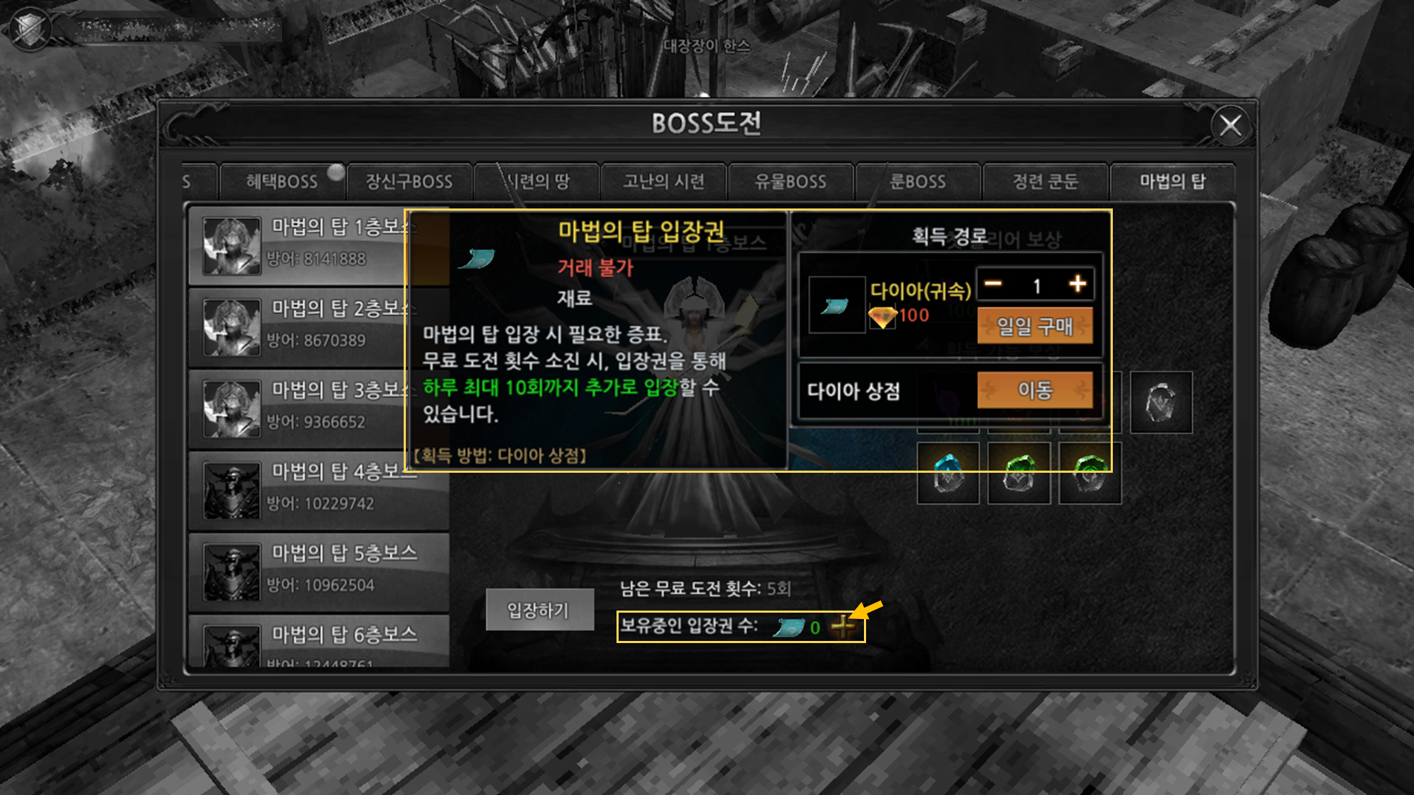 ※ [다이아 상점]에서 '마법의 탑 입장권'을 구매하면, 일일 최대 10회 추가 도전할 수 있습니다.