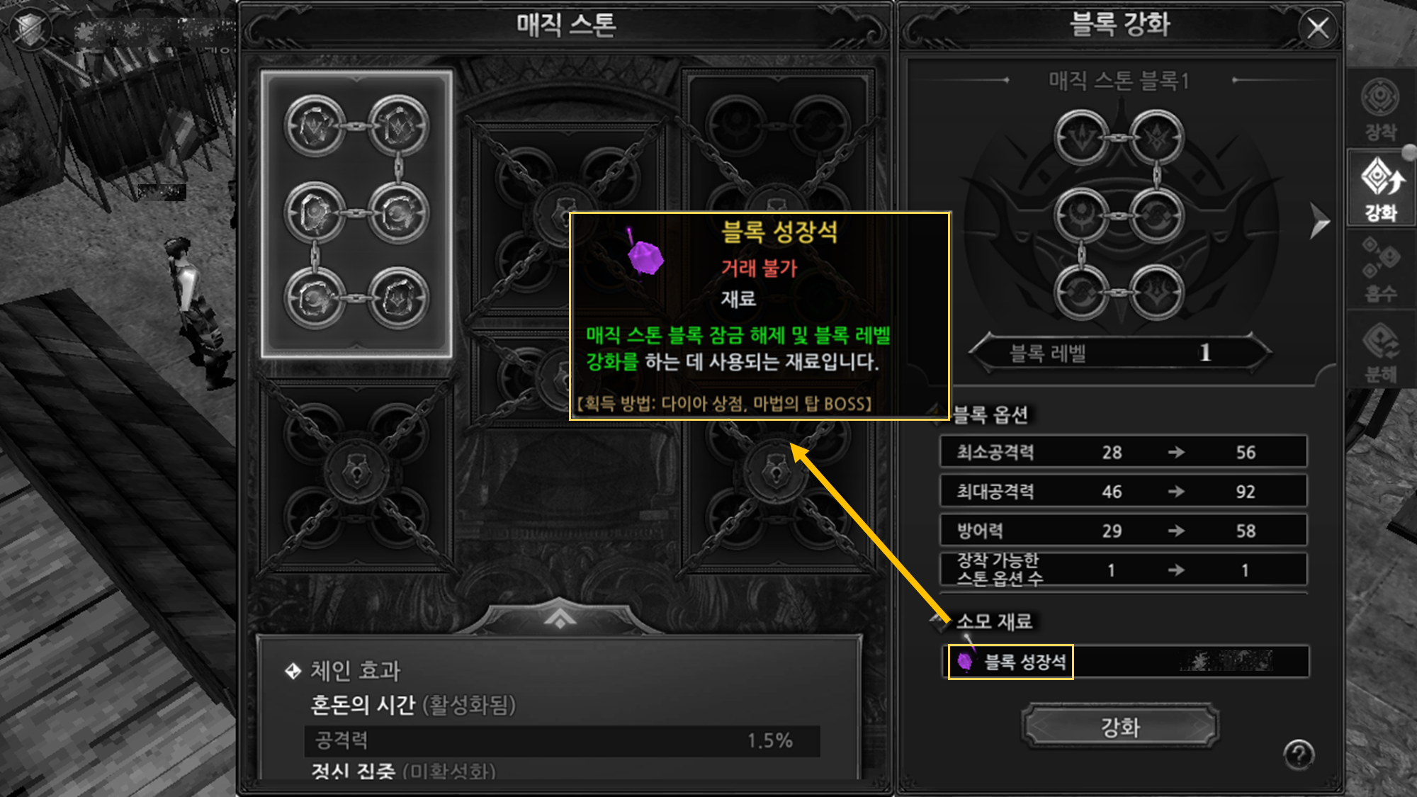블록에 장착할 '스톤'은 '마법의 탑 보스'를 처치하여 획득해야 합니다.