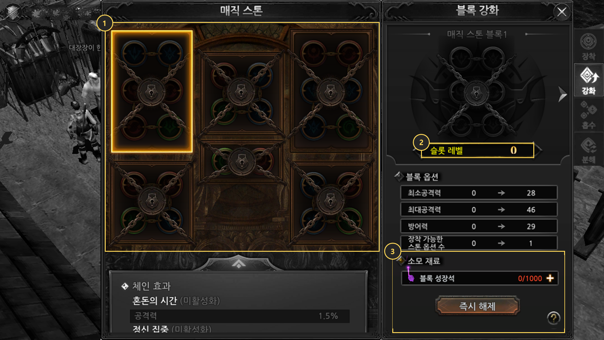 ③ 블록 해금 및 업그레이드에 필요한 블록 성장석 개수를 확인할 수 있습니다.