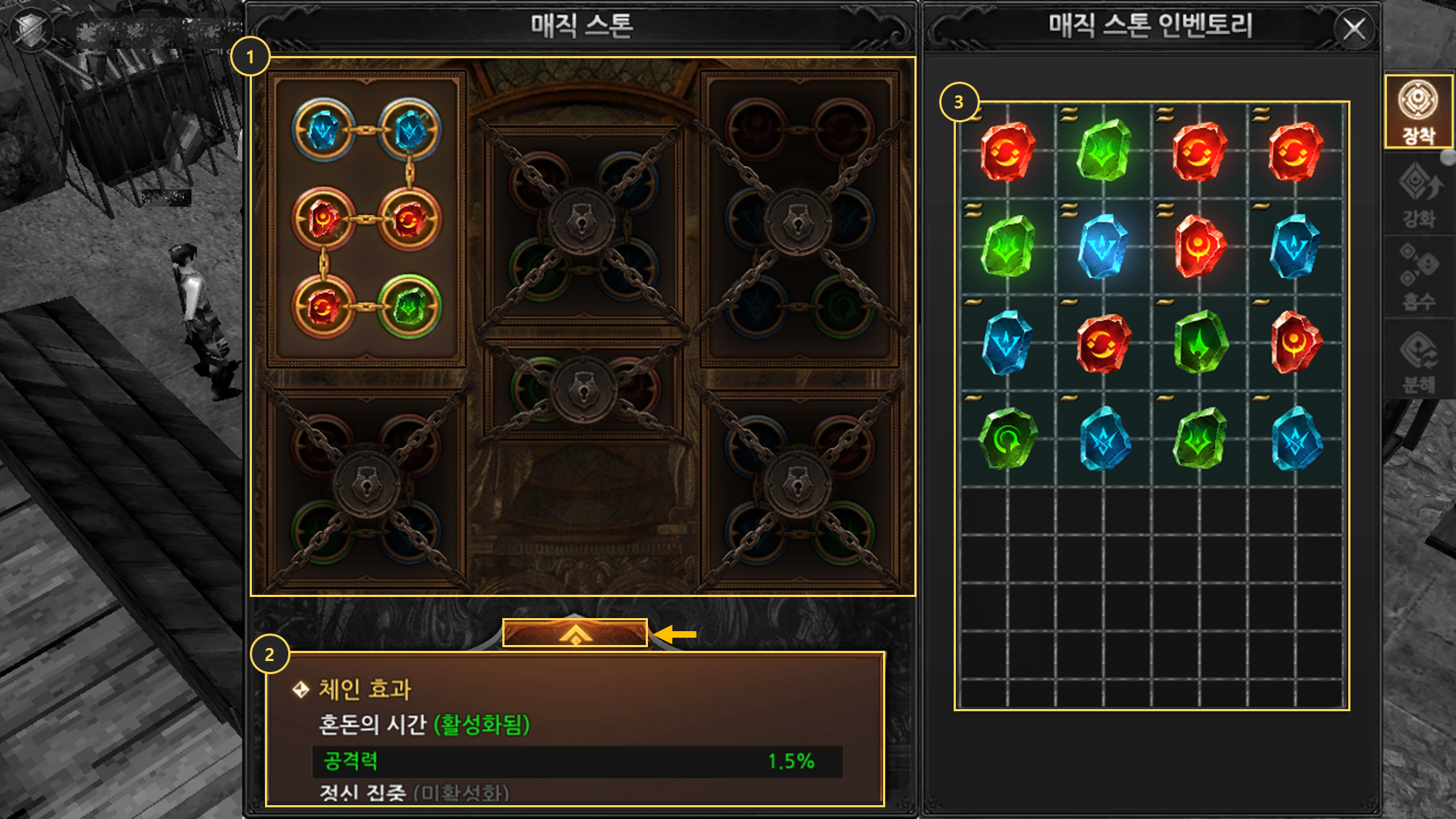 ① 블록별 '스톤' 장착 상태를 알 수 있습니다.